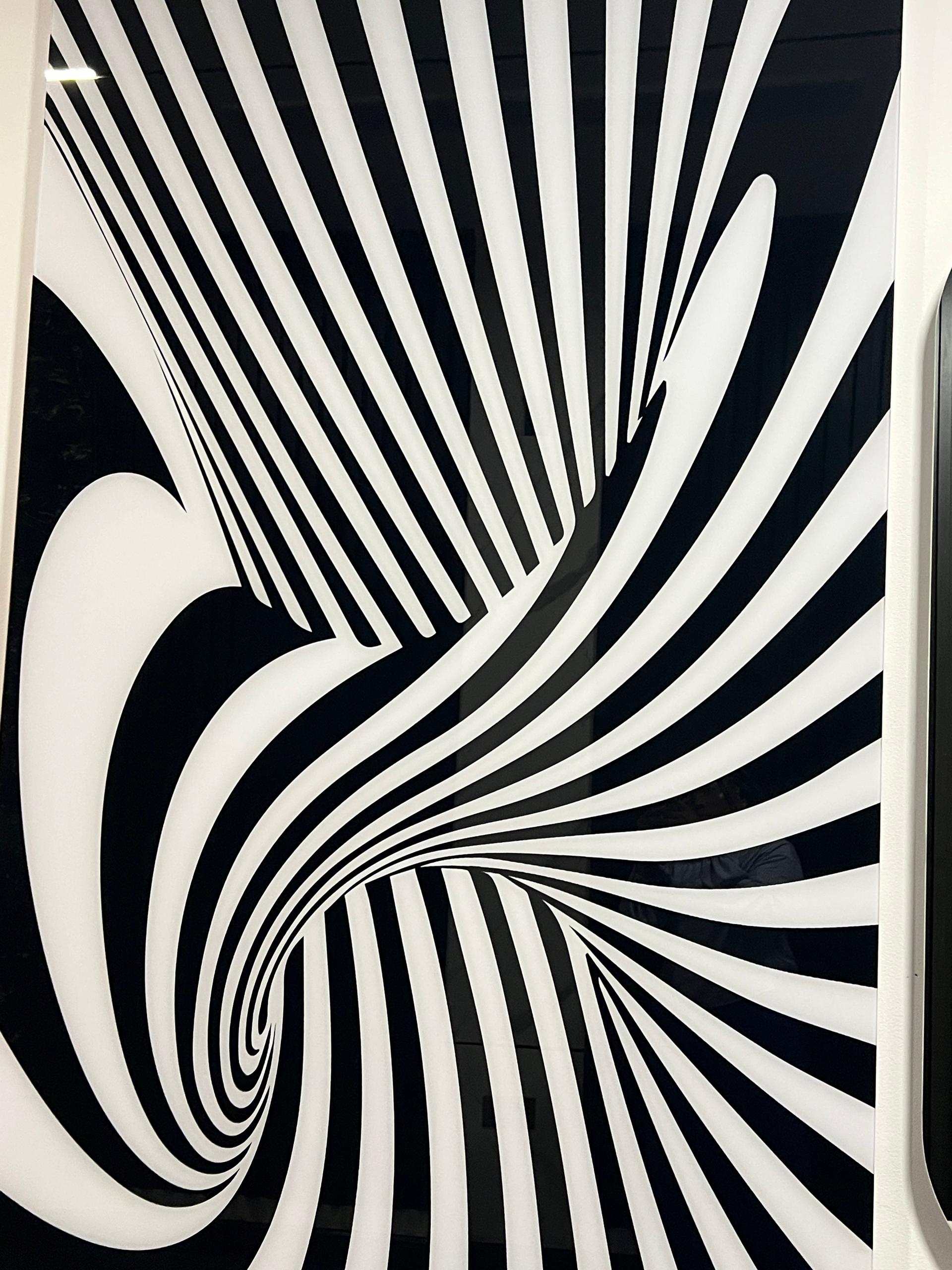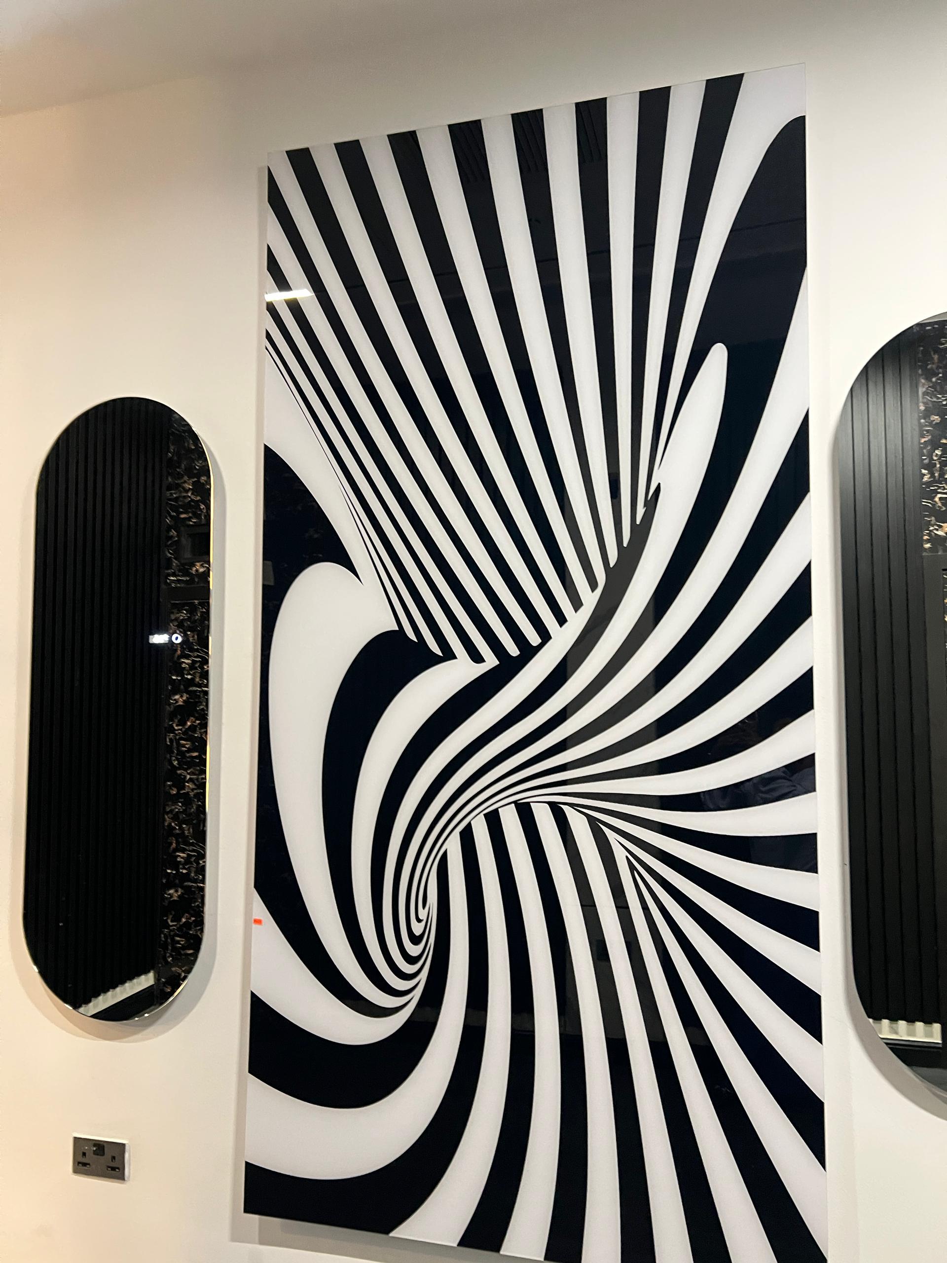 BM–Acrylic Glass Print 007 is a striking modern wall art piece designed to command attention. Featuring a bold black-and-white optical swirl pattern encased in premium acrylic glass, it delivers a sleek, high-gloss finish that instantly elevates any interior. This artwork adds depth, motion, and contemporary flair to living rooms, hallways, offices, showrooms, and luxury spaces.
