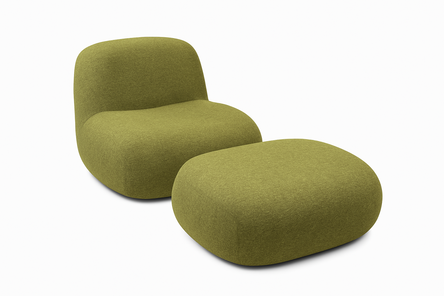 - Overall Configuration: Two-piece modular lounge seating system with sculptural chair and complementary ottoman featuring rounded organic forms and low-profile design