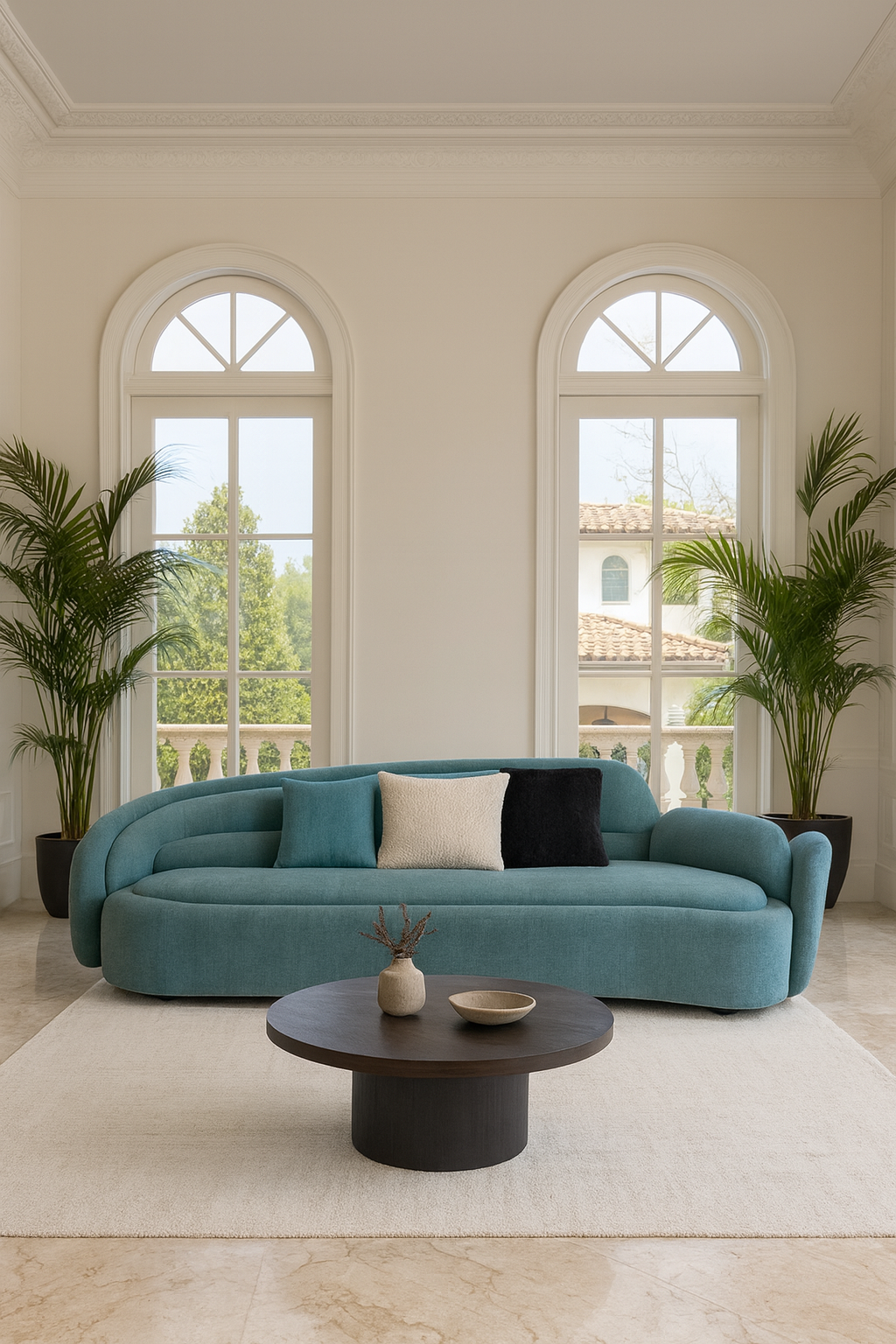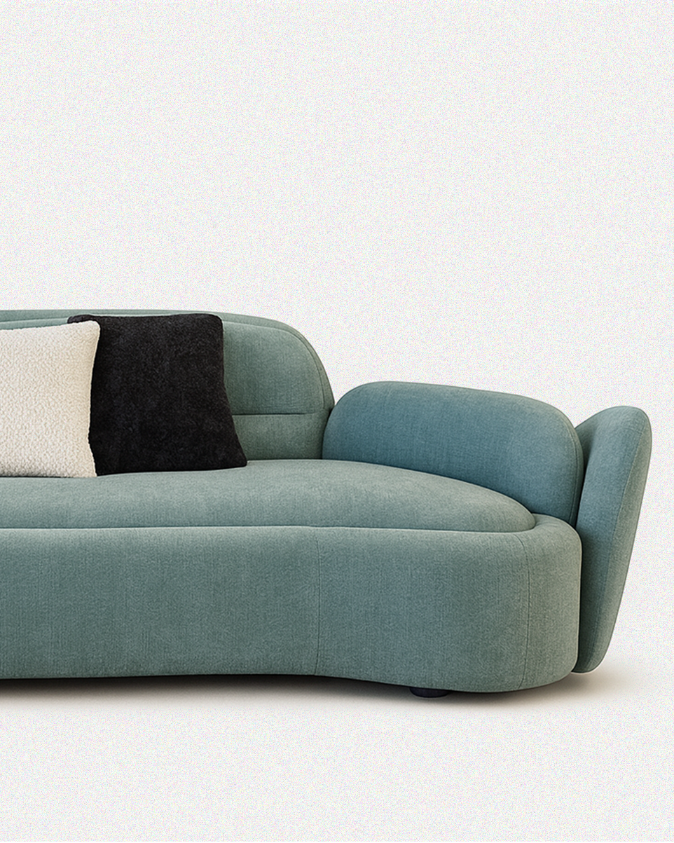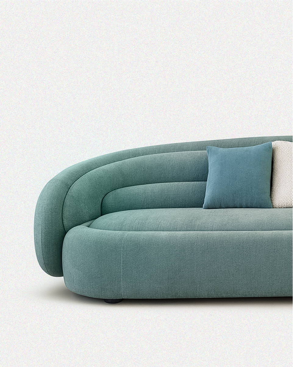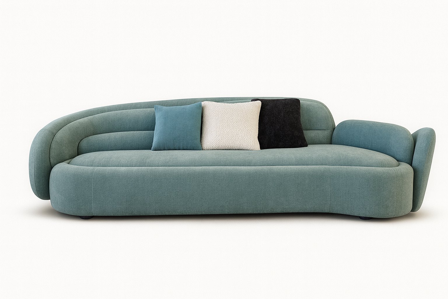Make a bold statement in your modern interior design with this striking curved organic sofa featuring distinctive sculptural architecture that delivers exceptional comfort and contemporary visual sophistication. This distinguished seating system showcases premium teal-blue upholstery with soft textured fabric finish and subtle channel tufting details, presenting flowing curved silhouettes with rounded cushioned forms that create inviting lounge zones while maintaining artistic placement versatility that enhances modern residential and commercial environments through intelligent sculptural furniture integration and refined comfort management perfect for living rooms, hospitality lounges, contemporary residences, boutique hotels, design showrooms, and upscale modern interiors.