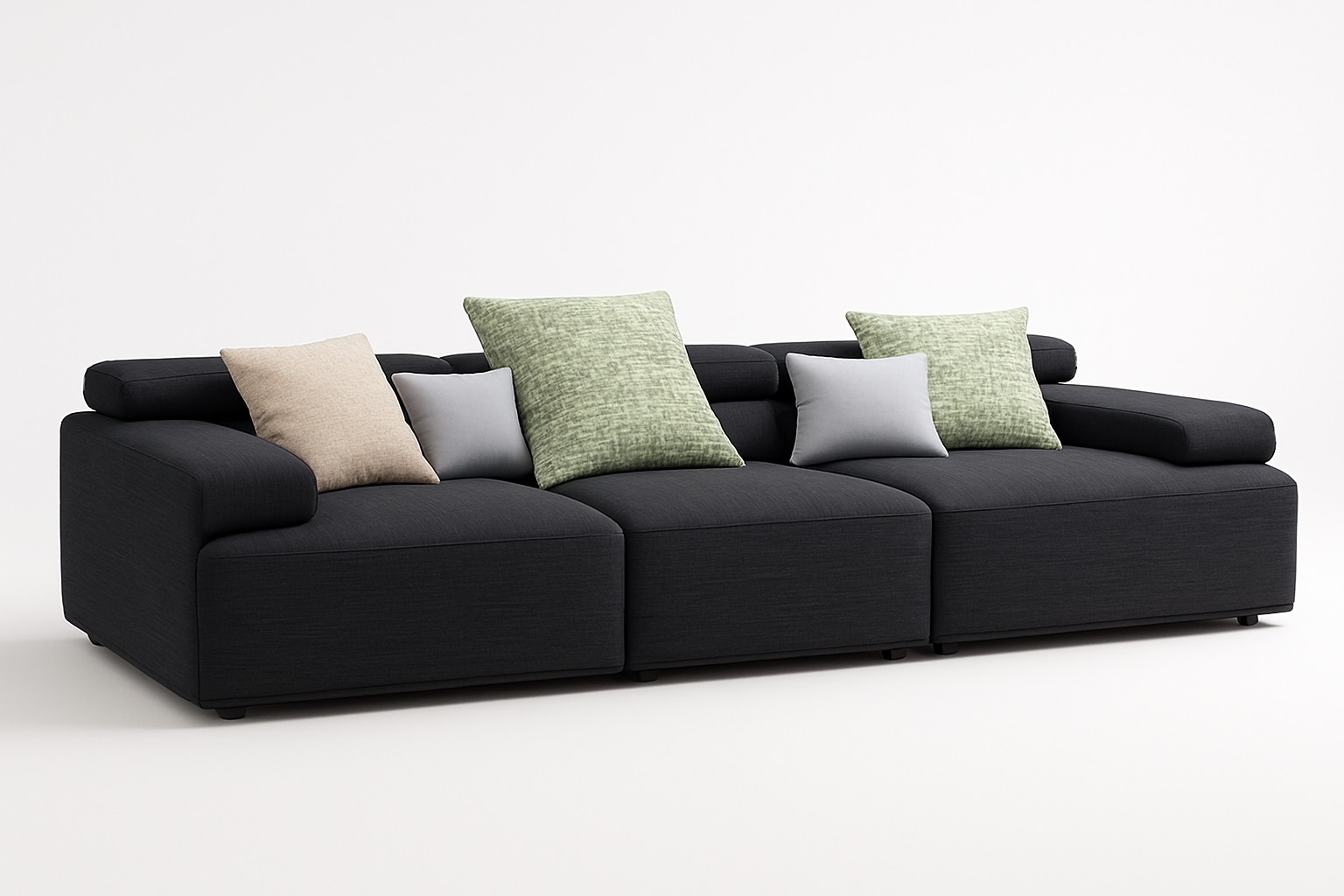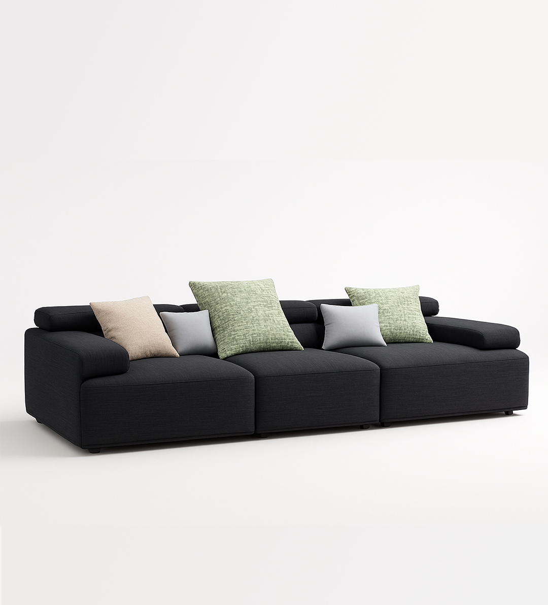 Create a stunning focal point in your contemporary living space with this exceptional modern modular sectional sofa featuring an ultra-low profile design and oversized plush cushioning that delivers remarkable comfort and bold architectural presence. This distinguished contemporary furniture piece showcases premium charcoal gray upholstery with generous deep-seated cushions and a sleek three-piece configuration, complemented by coordinating accent pillows in sage green, light gray, and natural beige tones that creates inviting lounging zones while maintaining minimalist design sophistication that enhances modern residential and commercial environments through intelligent modular integration and refined seating management perfect for living rooms, entertainment areas, loft spaces, contemporary residences, creative studios, and upscale modern interiors.