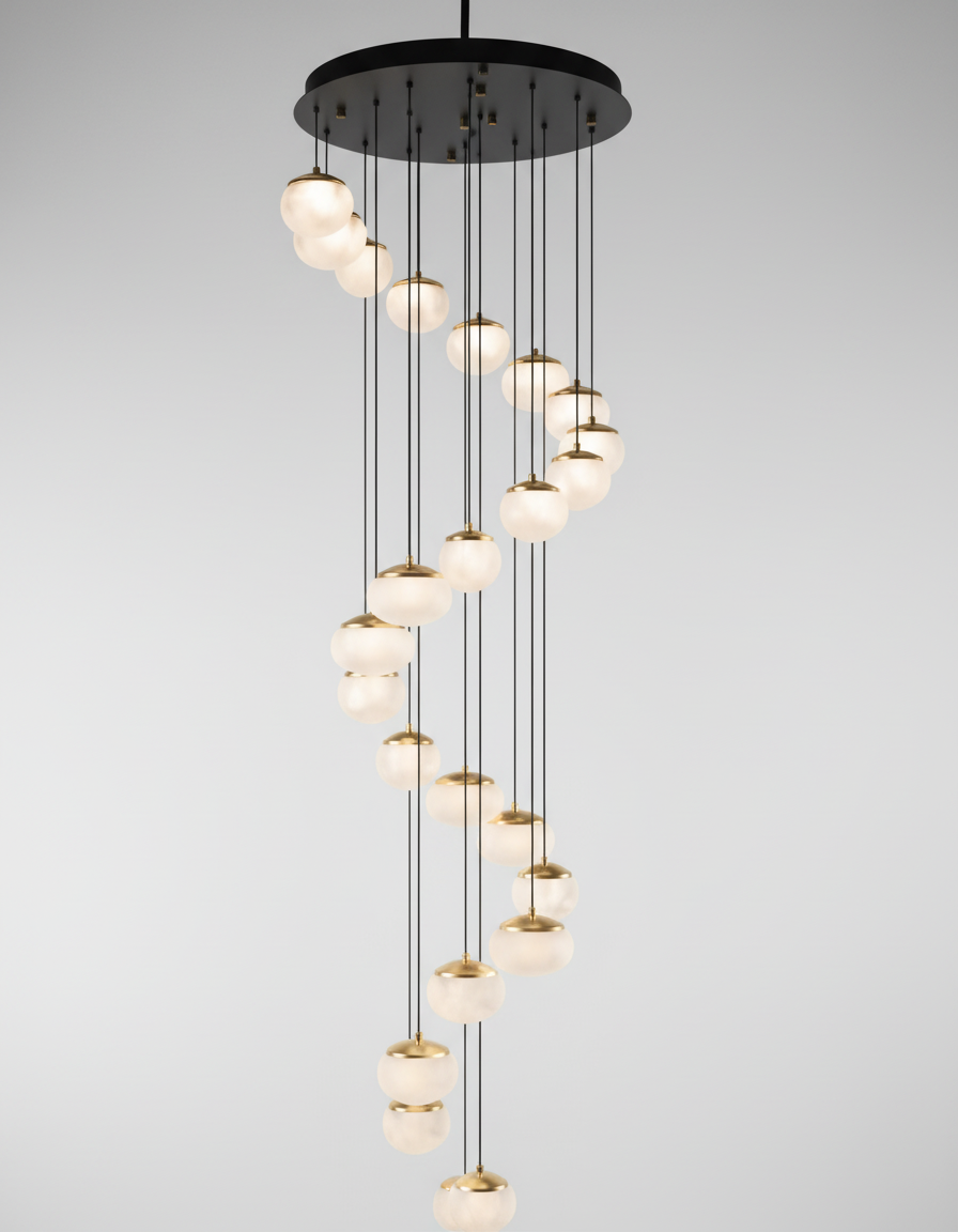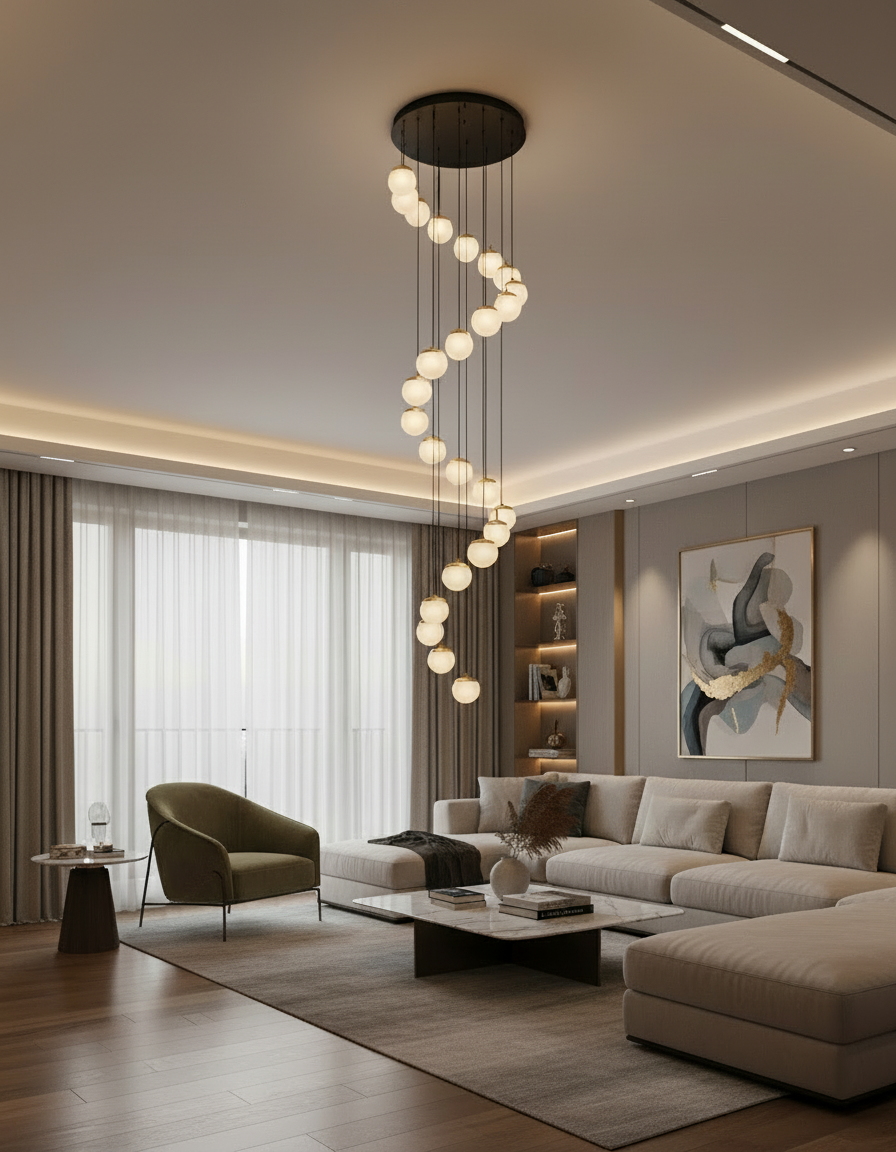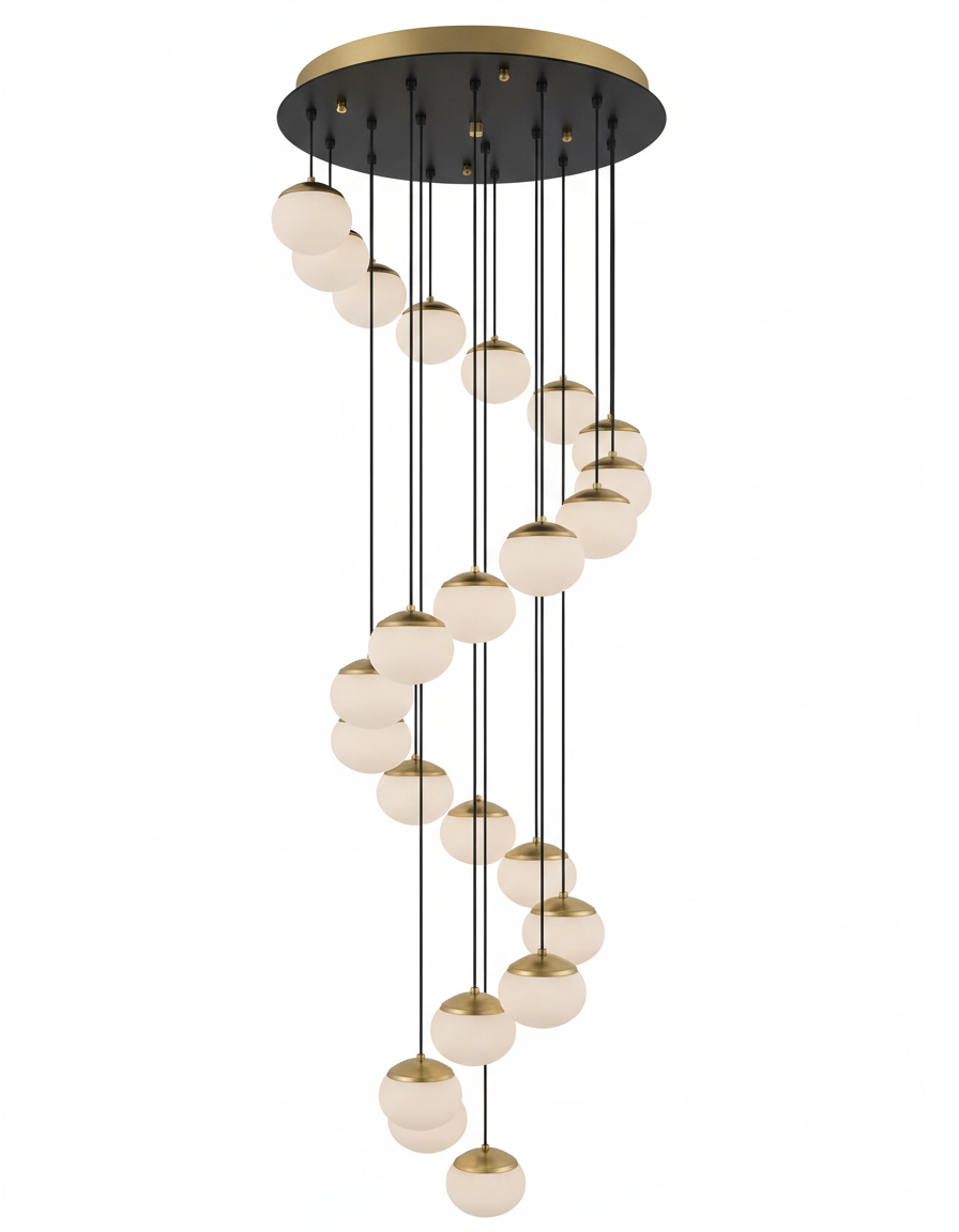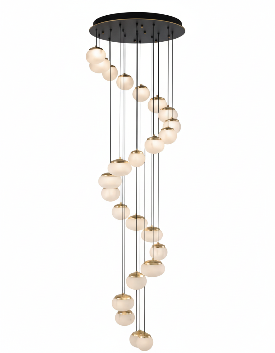 Dramatic 25-Light Configuration: Features twenty-five individual luminous globes suspended at varying heights, creating a stunning, cascading spiral effect that draws the eye upward.