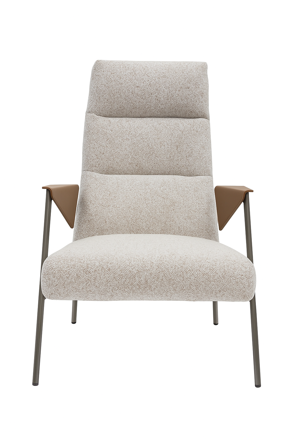Make a refined statement in your modern interior design with this striking mid-century inspired high-back lounge chair featuring sleek angular architecture that delivers exceptional comfort and timeless visual appeal. This distinguished seating solution showcases premium light grey textured upholstery complemented by sculptural cognac leather armrests and gunmetal grey metal frame, presenting sophisticated linear silhouettes that create inviting relaxation zones while maintaining professional placement versatility that enhances modern residential and commercial environments through intelligent contemporary furniture integration and refined comfort management perfect for living rooms, reading areas, home offices, hospitality lounges, reception spaces, and upscale modern interiors.