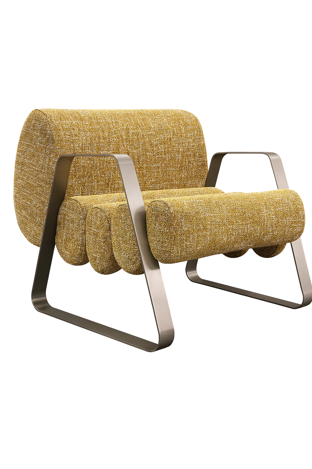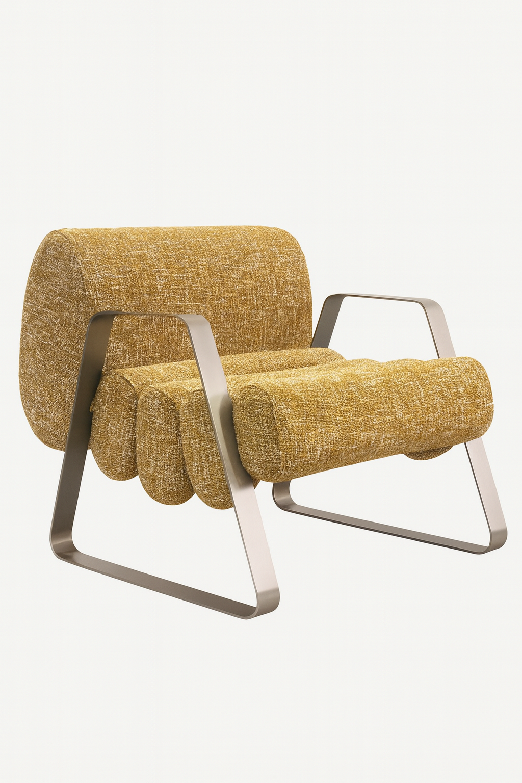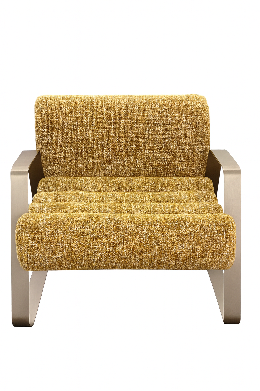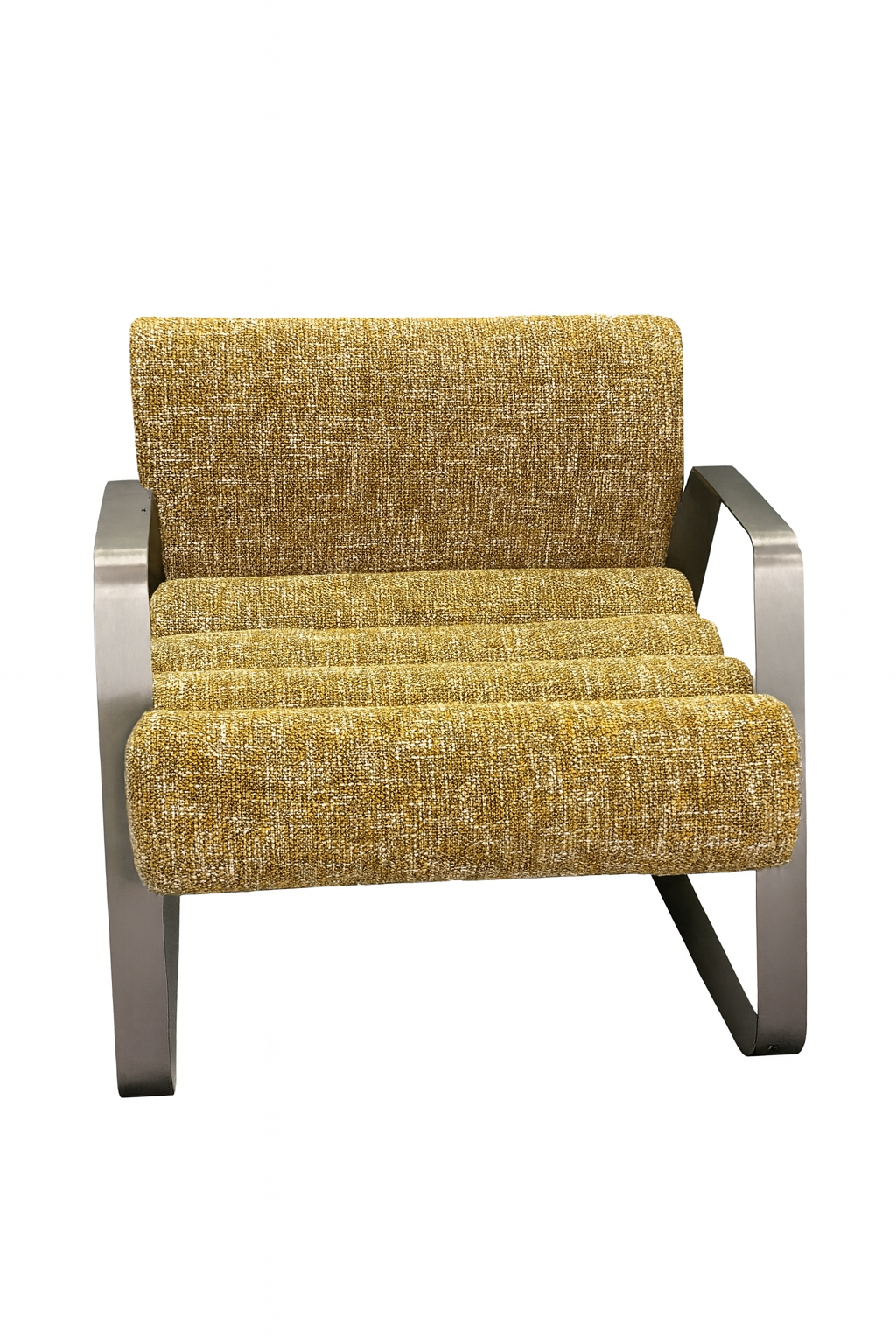 This exceptional seating solution represents the perfect fusion of contemporary architectural sophistication with intelligent comfort-focused functionality. Its professional construction with distinctive angular geometric design creates gallery-worthy visual experiences while providing comfortable individual seating capability. The combination of premium gold chenille upholstery with luxurious textured quality, distinctive exposed brushed metal frame, substantial sled-base construction, channeled cushion detailing, clean geometric proportions, dramatic metallic-textile contrast, generous armchair configuration, and elegant architectural composition ensures this piece serves as both sophisticated design statement centerpiece and functional seating component.