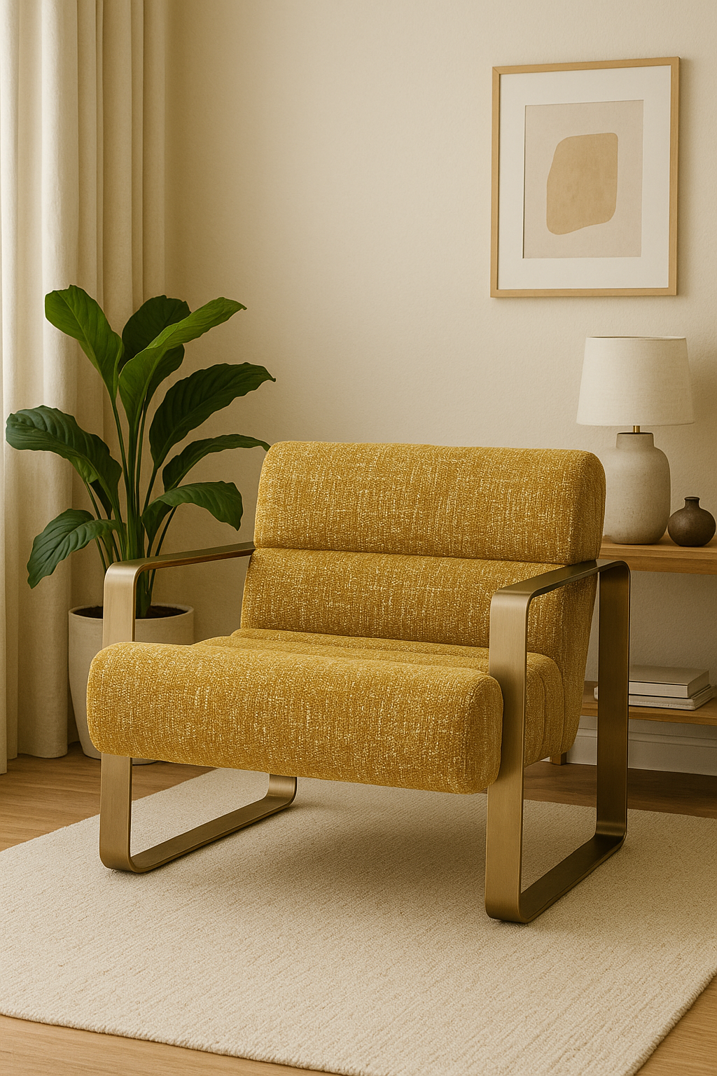 Contemporary Industrial Luxury: This premium geometric armchair represents cutting-edge architectural furniture design, combining avant-garde angular forms with intelligent comfort-focused functionality. The sophisticated gold chenille finish with textured woven surface, distinctive exposed brushed metal frame, substantial sled-base construction, channeled cushion detailing, clean geometric proportions, and refined architectural presence creates elegant placement flexibility while the commanding industrial-luxe appearance adds refined glamour that transforms modern spaces into gallery-quality environments perfect for design-forward living rooms, contemporary residences, boutique hospitality spaces, executive offices, creative studios, upscale commercial lounges, designer showrooms, and premium installations seeking exceptional statement furniture with striking architectural character and sophisticated metallic-textile contrast elegance.
