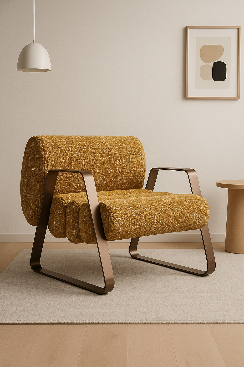 Make a bold architectural statement in your modern interior with this extraordinary contemporary geometric armchair featuring a dramatic angular silhouette with exposed brushed metal frame that delivers exceptional visual impact and inviting comfort. This distinguished avant-garde furniture piece showcases premium gold chenille upholstery with textured woven finish and clean geometric lines throughout, paired with substantial brushed champagne metal sled-base arms, creating a striking statement piece while maintaining plush seating sophistication that enhances modern residential and commercial environments through intelligent architectural integration and refined comfort management perfect for living rooms, boutique hotels, design studios, contemporary residences, executive offices, upscale lounges, and sophisticated modern spaces seeking distinctive furniture with dramatic industrial-luxe presence.